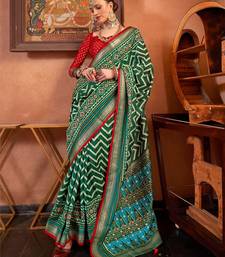 Green patola silk blend saree with traditional motifs & zari::Contrast border | unstitched blouse