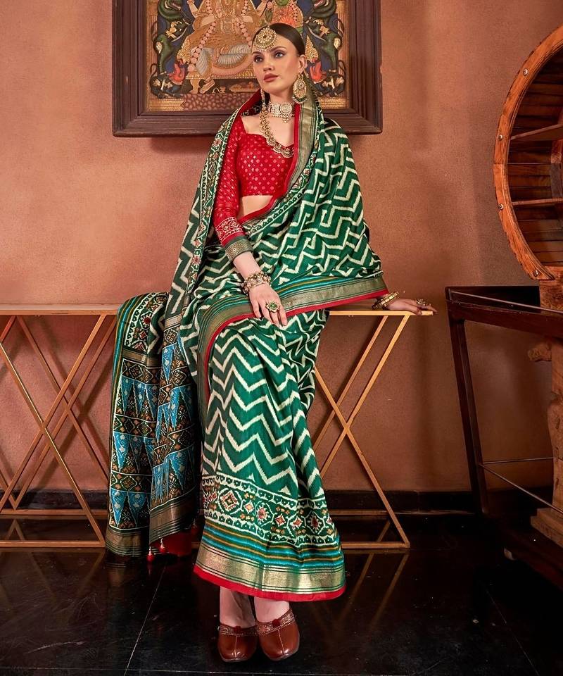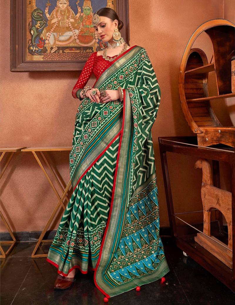 green patola silk blend saree with traditional motifs & zari/contrast border | unstitched blouse