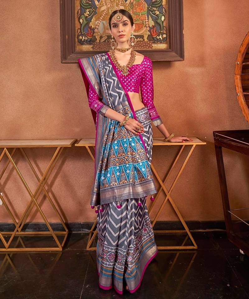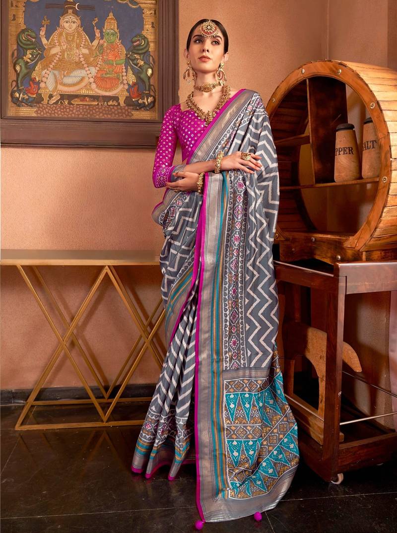 Grey patola silk blend saree with traditional motifs & zari::Contrast border | unstitched blouse
