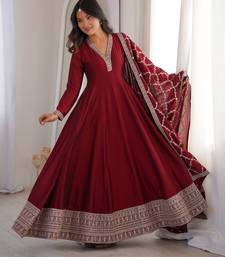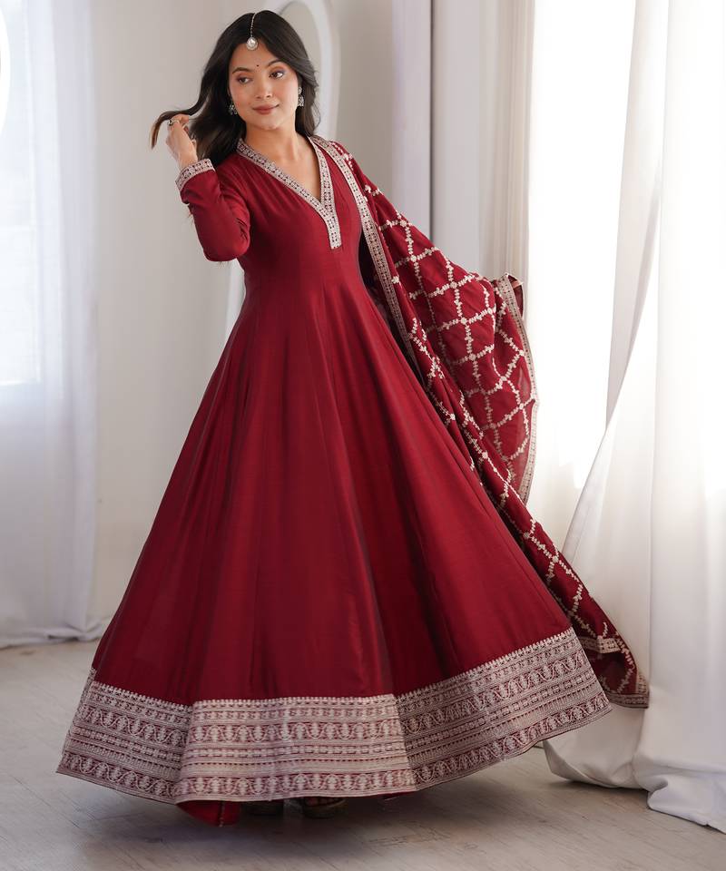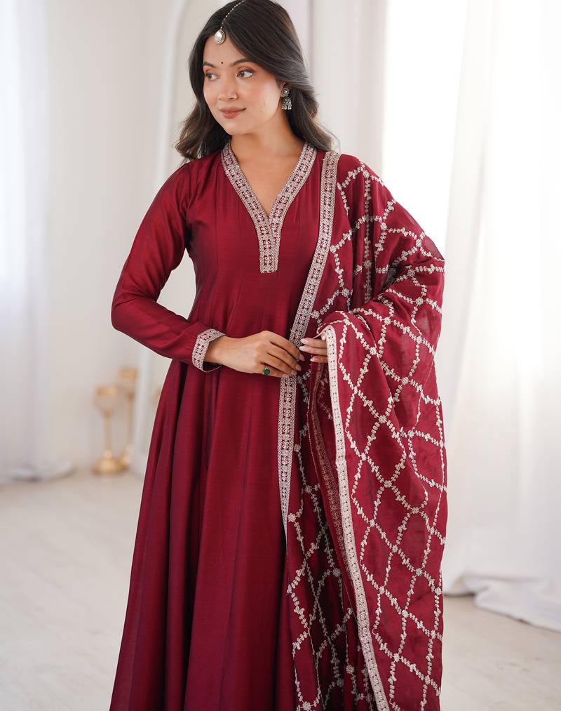 Product Name Maroon Embroidered Heavy Pure Blooming Vichitra Silk Fully Stitched Kali Pattern Anarkali Set