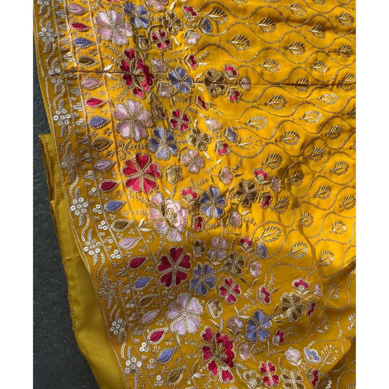 Mustard yellow faux georgette lehenga choli with multicolor thread & sequins embroidery