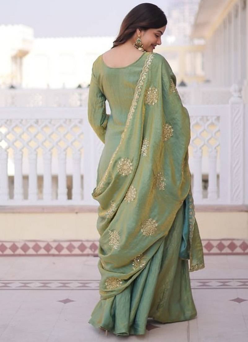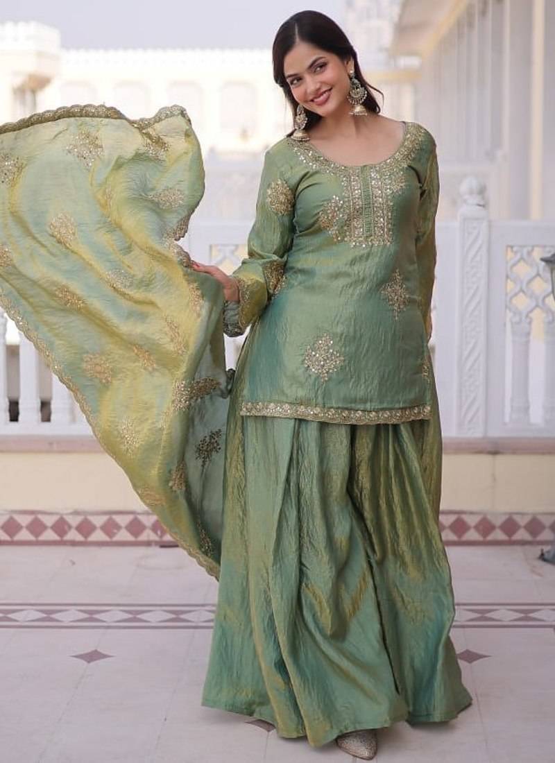 | Product Name | Olive Green Fendi Crush Embroidered Kurta Sharara Set With Dupatta | |