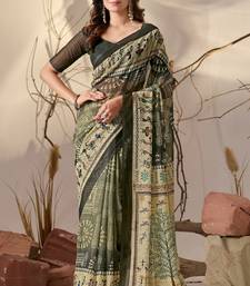 Olive green georgette saree with tribal warli digital prints & beige panel pallu | matching contrast printed blouse