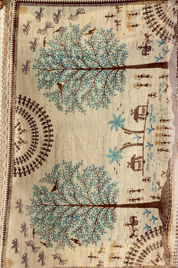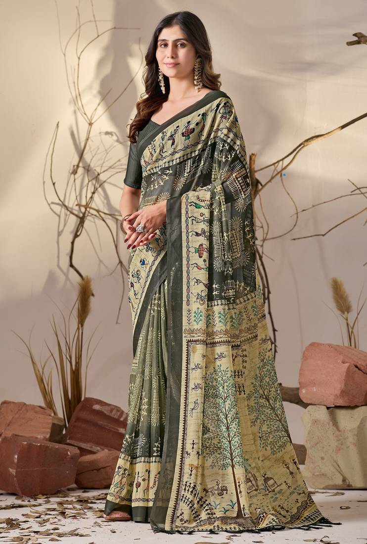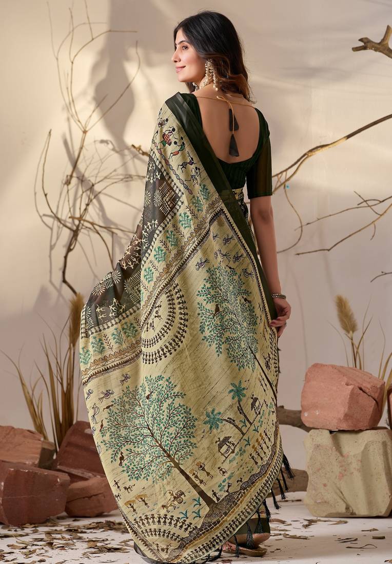 | Product Description | Fabric: Soft Georgette Saree In Olive Green With Traditional Tribal Warli Inspired Digital Prints And Rich Beige Panels Highlighted With Nature, Dance & Village Motifs + Intricate Tassel Detailing On The Pallu (5.5 Mtr Saree) Blouse: Matching Contrast Printed Blouse In Deep Olive Shade With Subtle Tribal Accents (0.80 Mtr) |