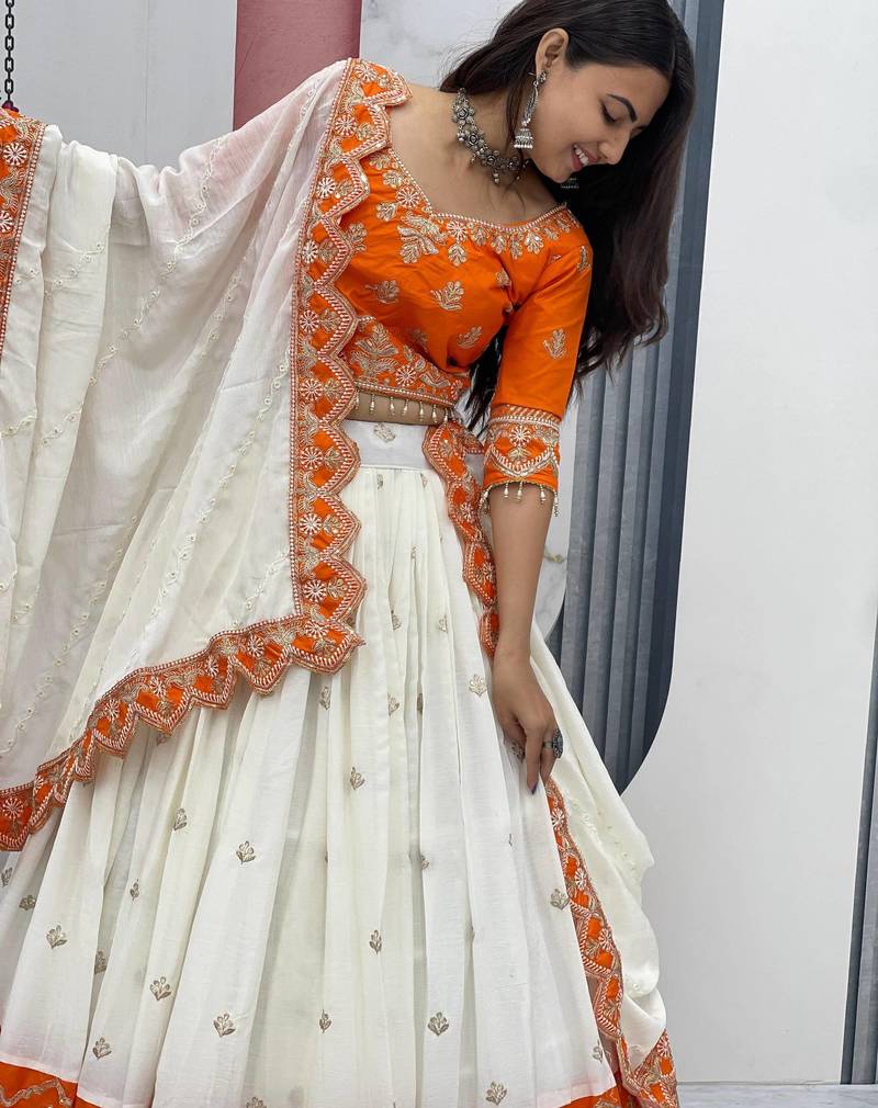 Orange chinon heavy embroidered coding sequin work lehenga choli with dupatta