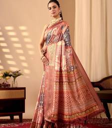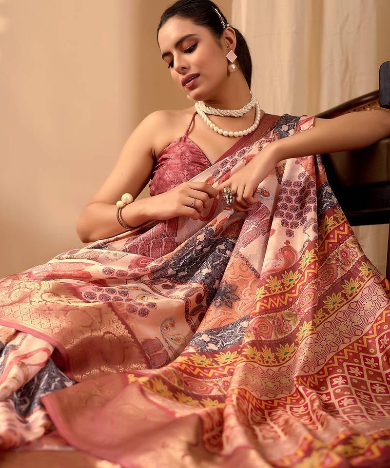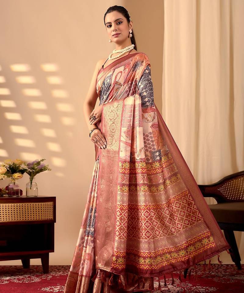 Peach soft lichi silk blend saree with traditional multicolor digital prints & designer contrast blouse