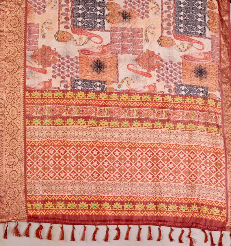 | Product Name | Peach Soft Lichi Silk Blend Saree With Traditional Multicolor Digital Prints & Designer Contrast Blouse | |