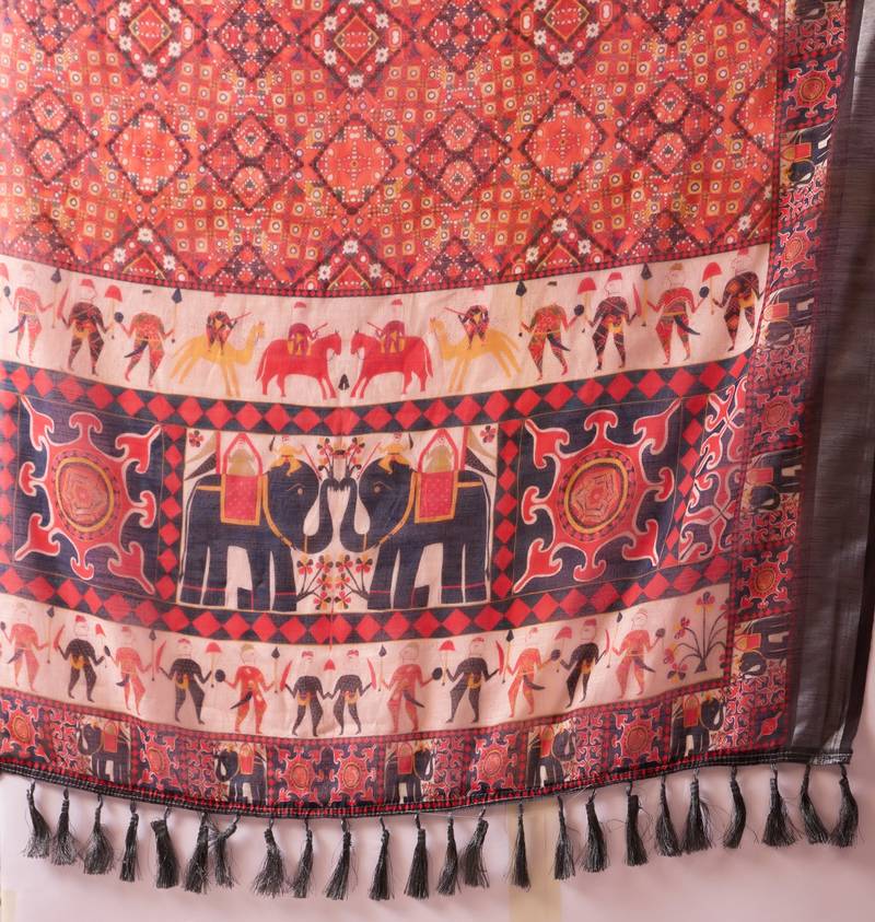 | Product Description | Fabric: Premium Linen Cotton Saree With Elegant Digital Floral & Royal Ethnic Print & Classic Contrast Patola Style Border (5.5 Mtr Saree) Blouse: Matching Contrast Printed Blouse (0.80 Mtr) |