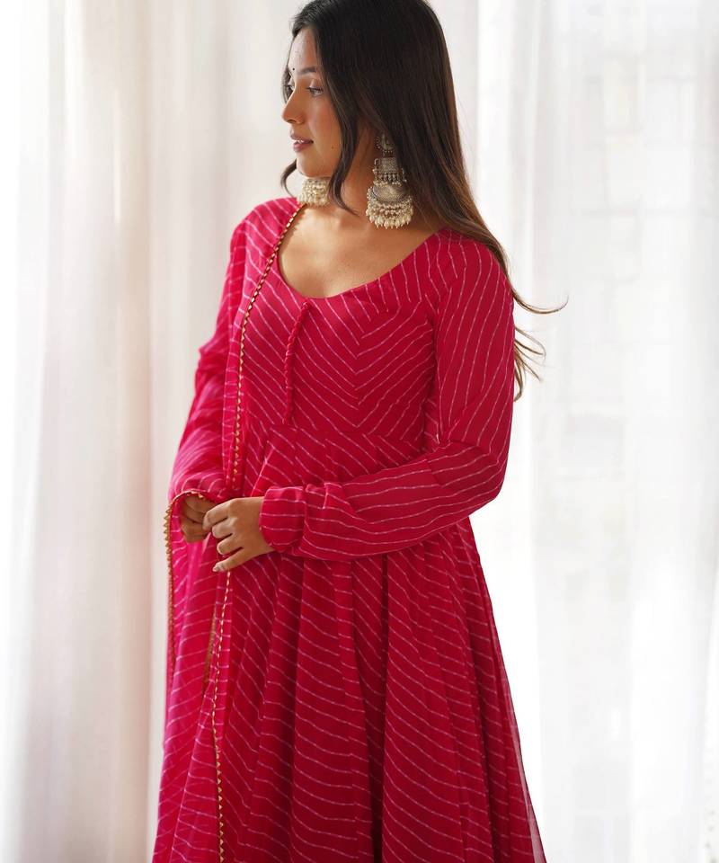 Product Name Rani Pink Leheriya Printed Fox Georgette Fully Stitched Flared Anarkali Suit Set