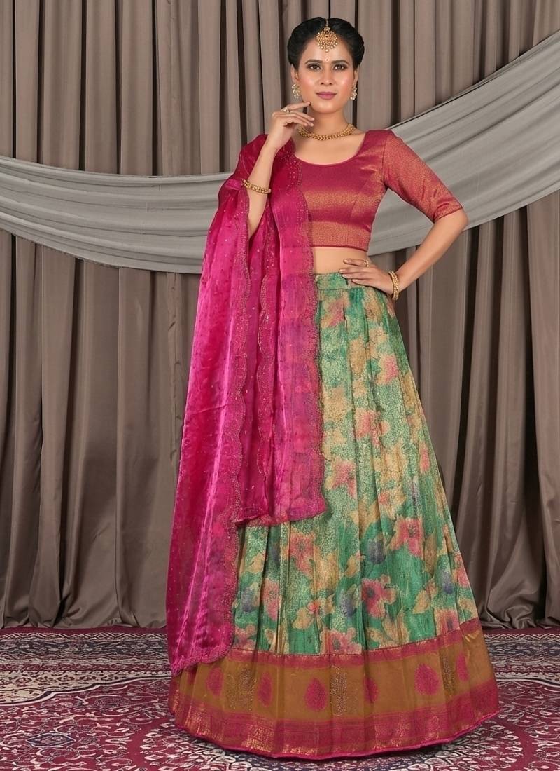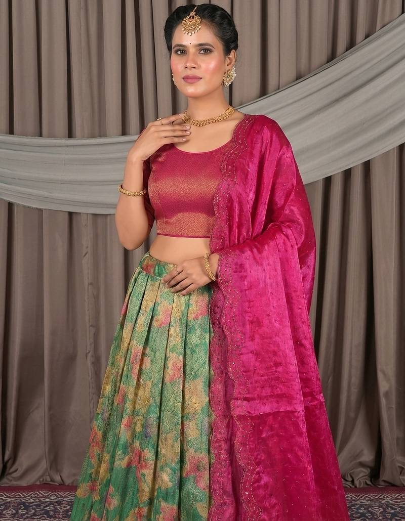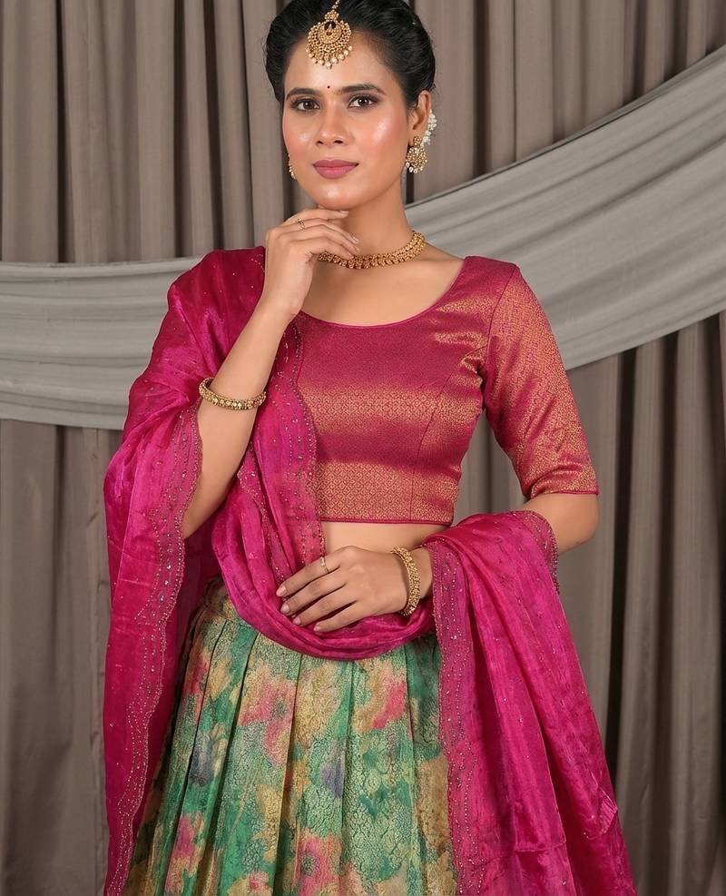 Rani pink & sea green banarasi jacquard printed lehenga choli