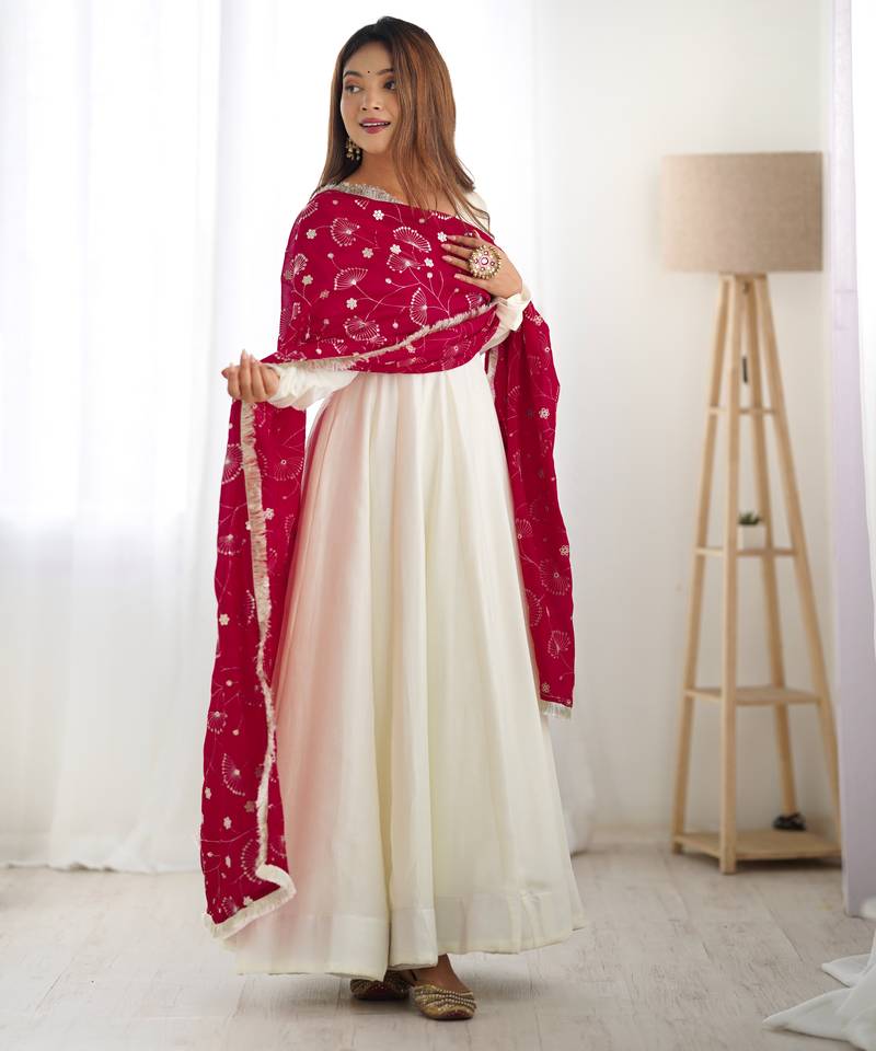 Product Name | Rani Pink Vichitra Silk Anarkali , Fancy Lace Dupatta And Stitched Pant Set, Fully Stitched Ready To Wear | |
