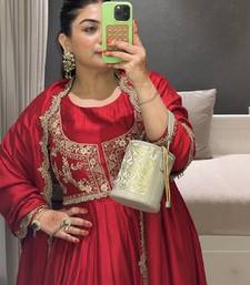 | Product Name | Red Embroidered Chinon Silk Gown Set With Koti, Full Stitched, Flared Style, Dupatta Included | |