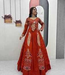 | Product Name | Rust Orange Vichitra Silk Thread Work Readymade Anarkali Style Lehenga Set | |