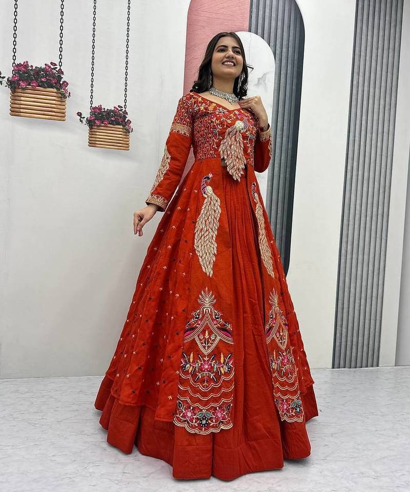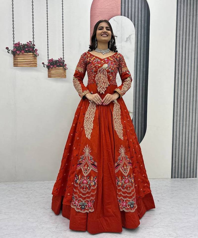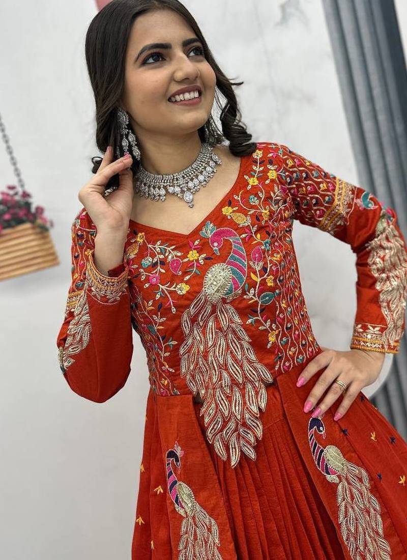 Rust orange vichitra silk thread work readymade anarkali style lehenga set