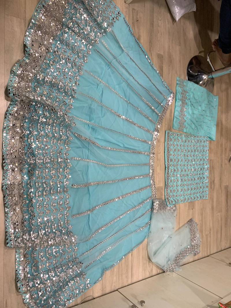 Sky blue soft net lehenga choli with zari & mirror embroidery work