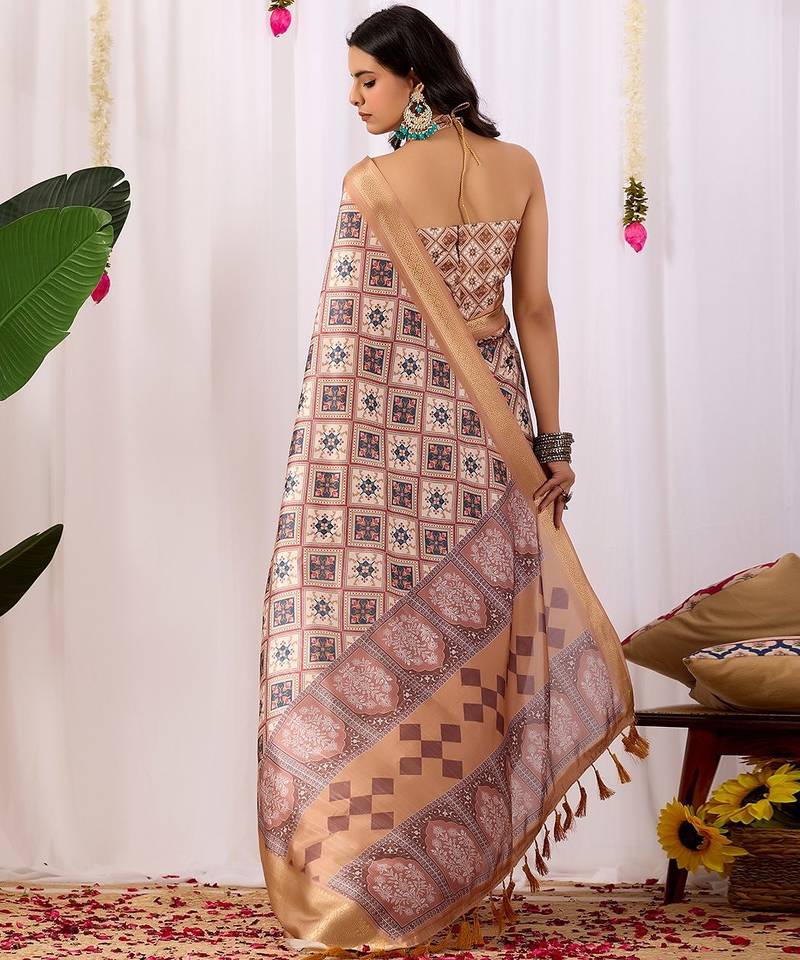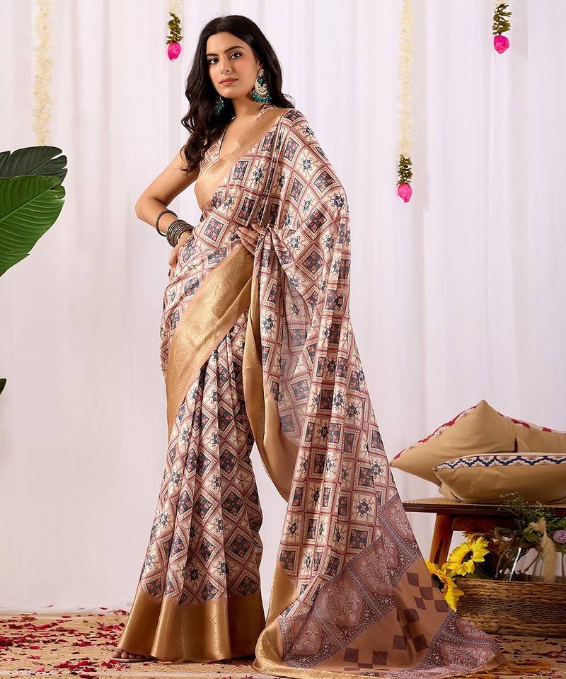 Soft lichi silk blend saree with traditional geometric prints & golden zari border