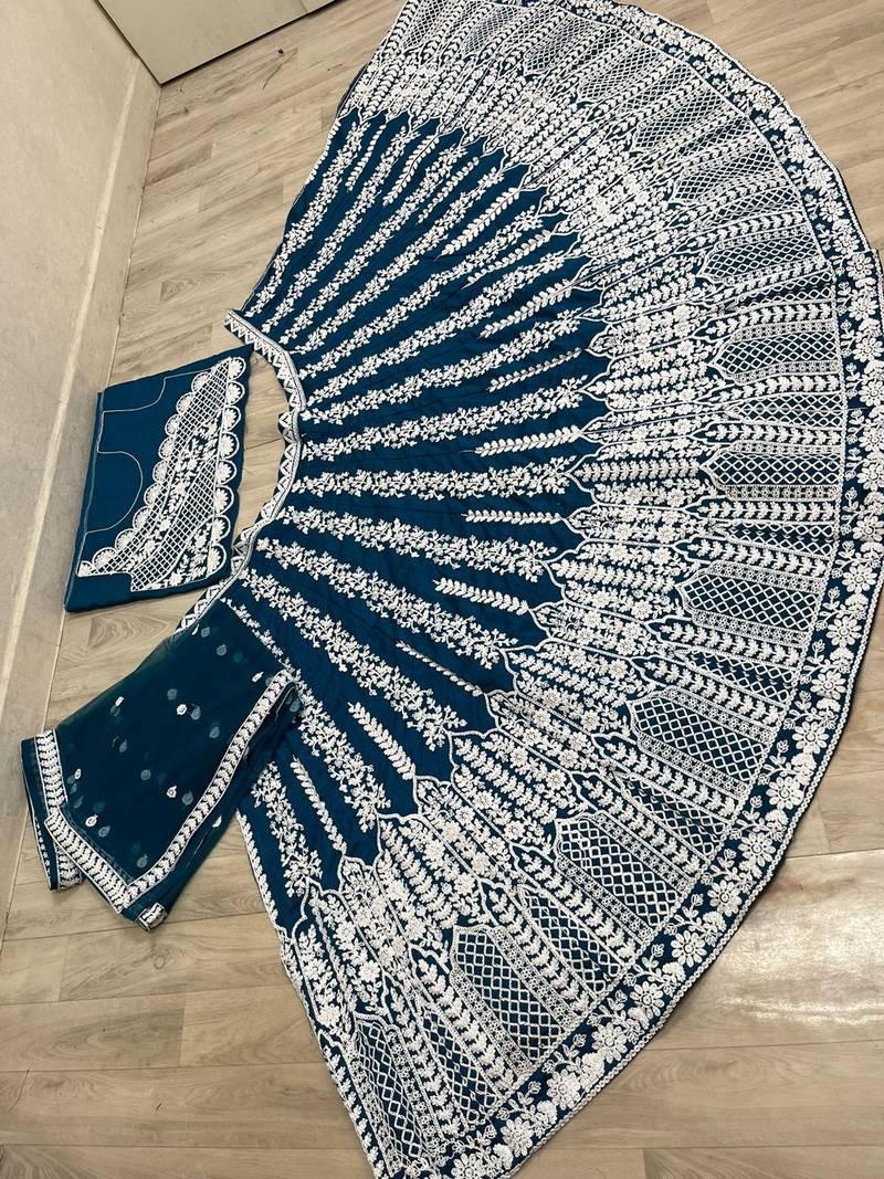 Teal blue party wear chinon embroidered lehenga