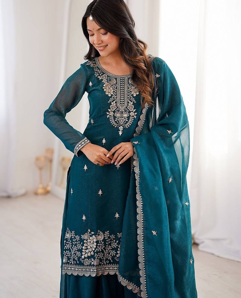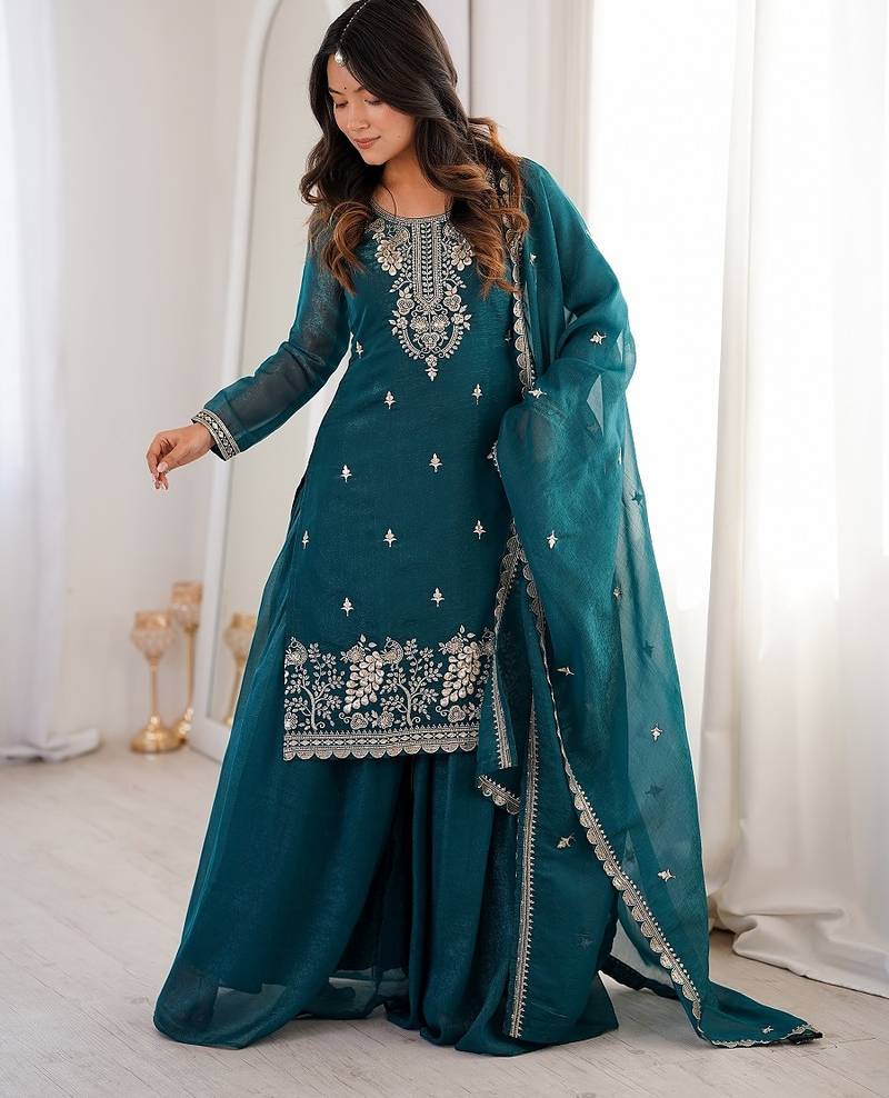 Teal green embroidered sequins thread zari work soft crunchy silk fully stitched kurta sharara set