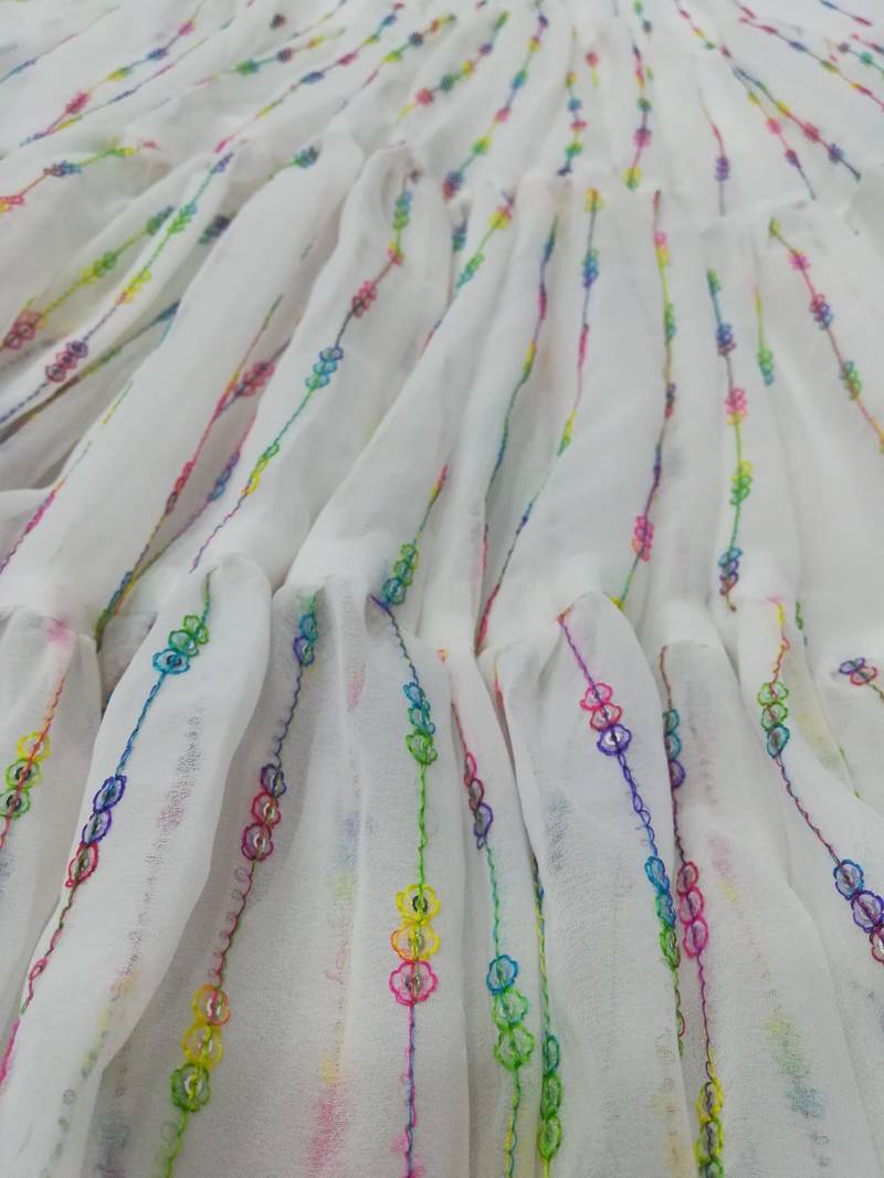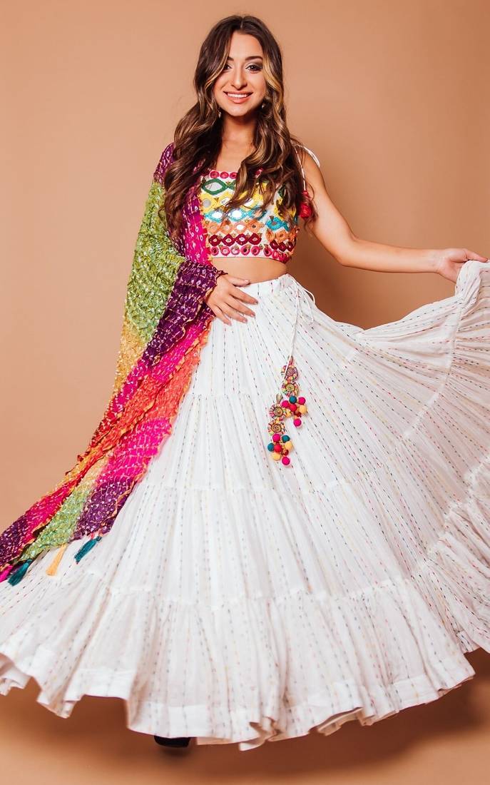 White georgette lehenga choli with multicolor thread & sequin embroidery and printed chiffon dupatta