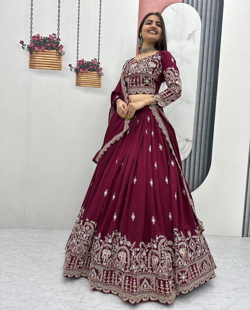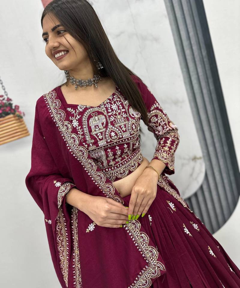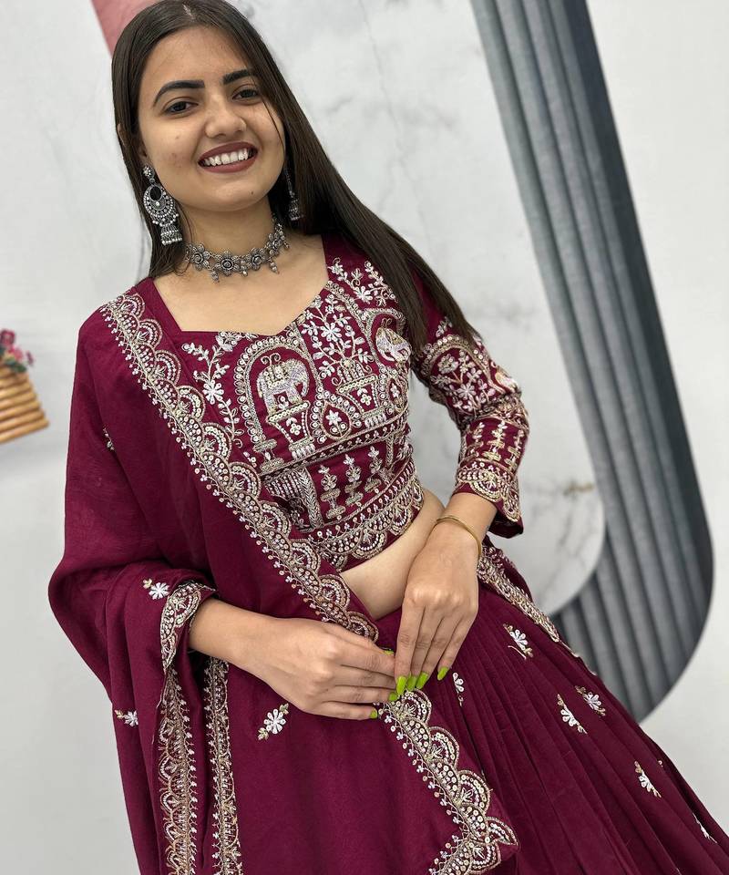 | Product Name | Wine Vichitra Silk Embroidered Lehenga Choli With Heavy Thread Sequence Work And Matching Designer Dupatta | |