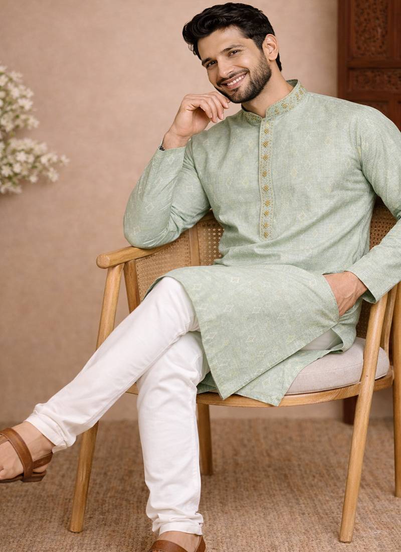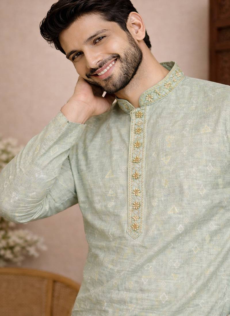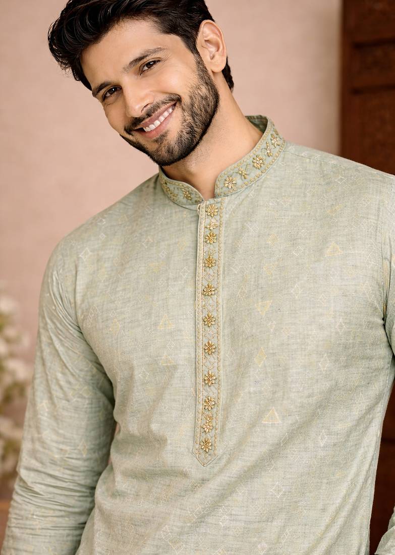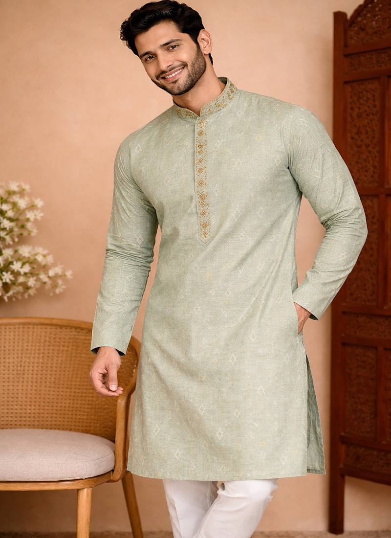 | Product Name | Green Color Jaquard With Embroidery Patti Slik Kurta Payjama Set | |