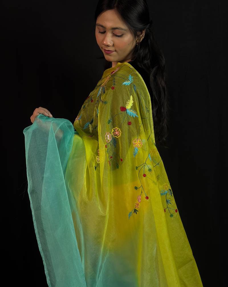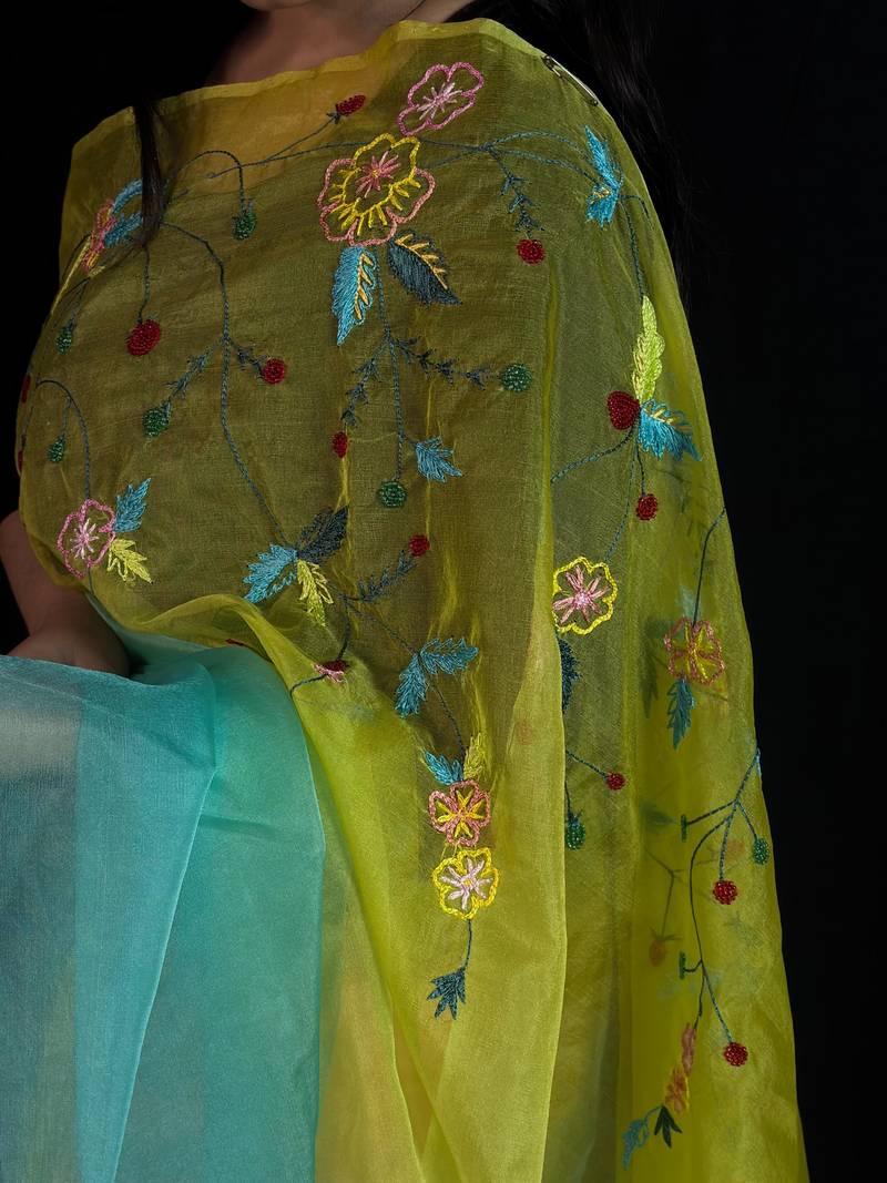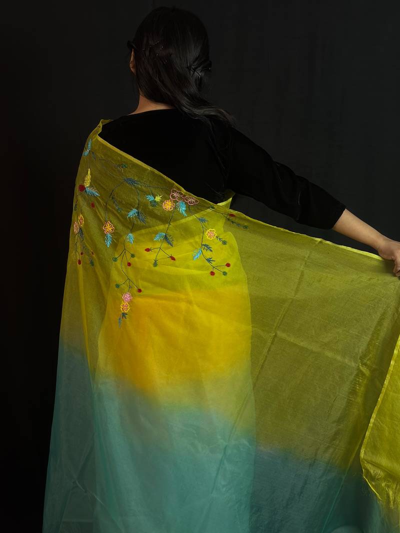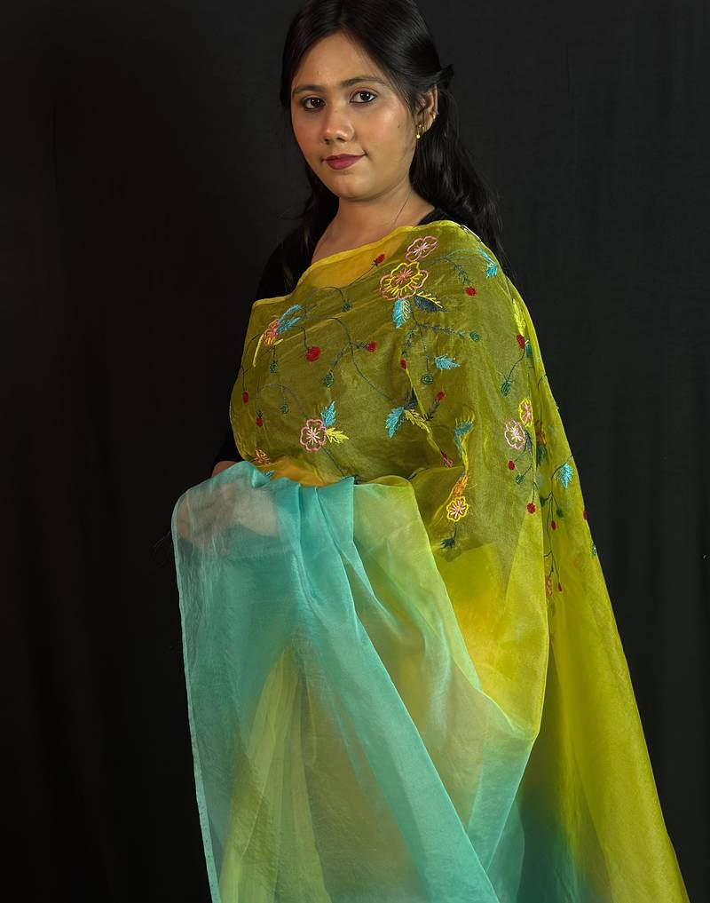 Green organza saree with hand embroidered work