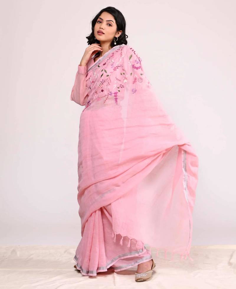 | Product Name | Pink Handloom Linen Saree With Hand Embroidered Work | |