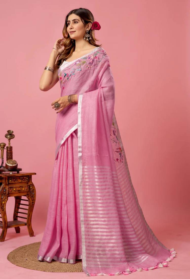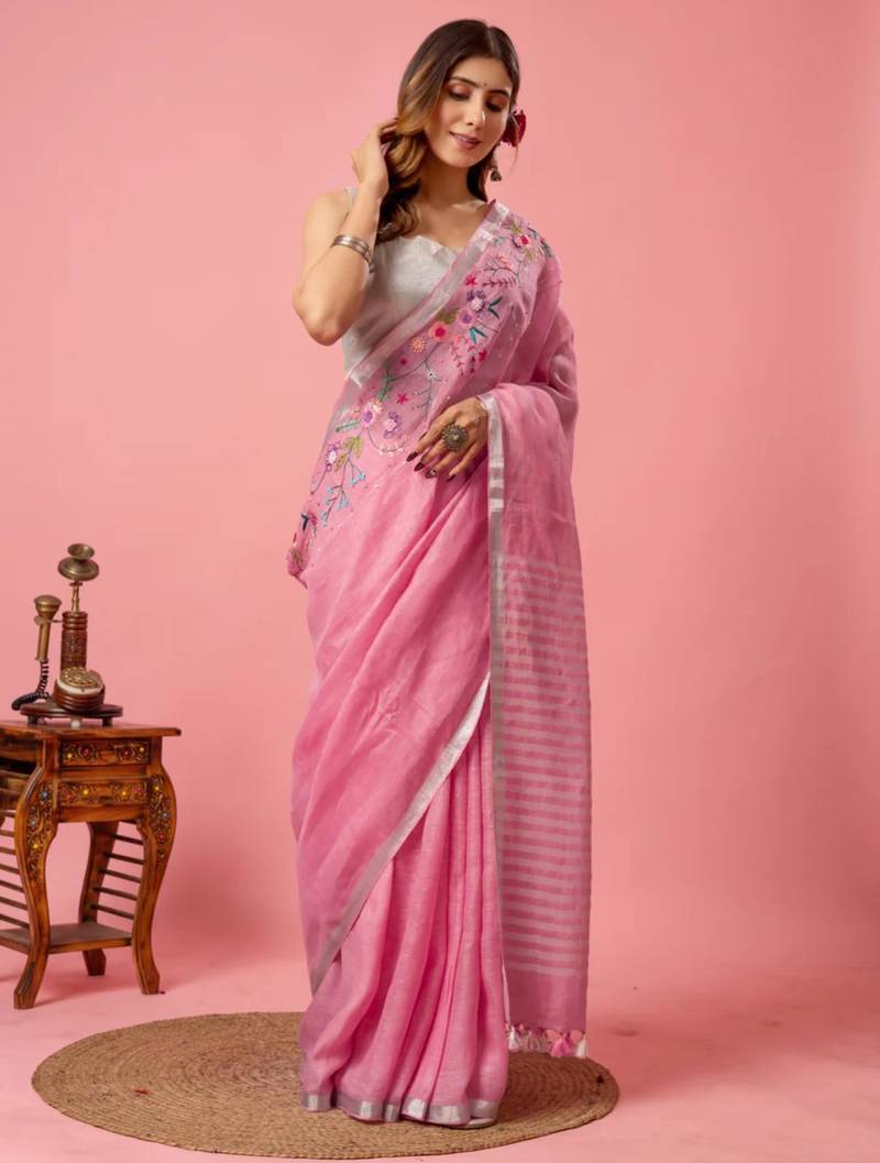 | Product Name | Pink Handloom Linen Saree With Hand Embroidered Work | |