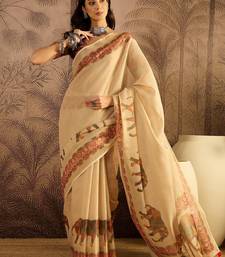 Beige silk cotton printed saree with unstitched blouse piece