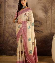 Beige tussar silk printed saree with unstitched blouse piece