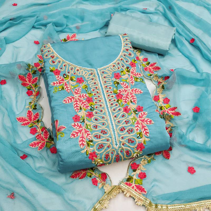 | Product Name | Blue Cotton Silk Embroidered Unstitched Dress Material | |