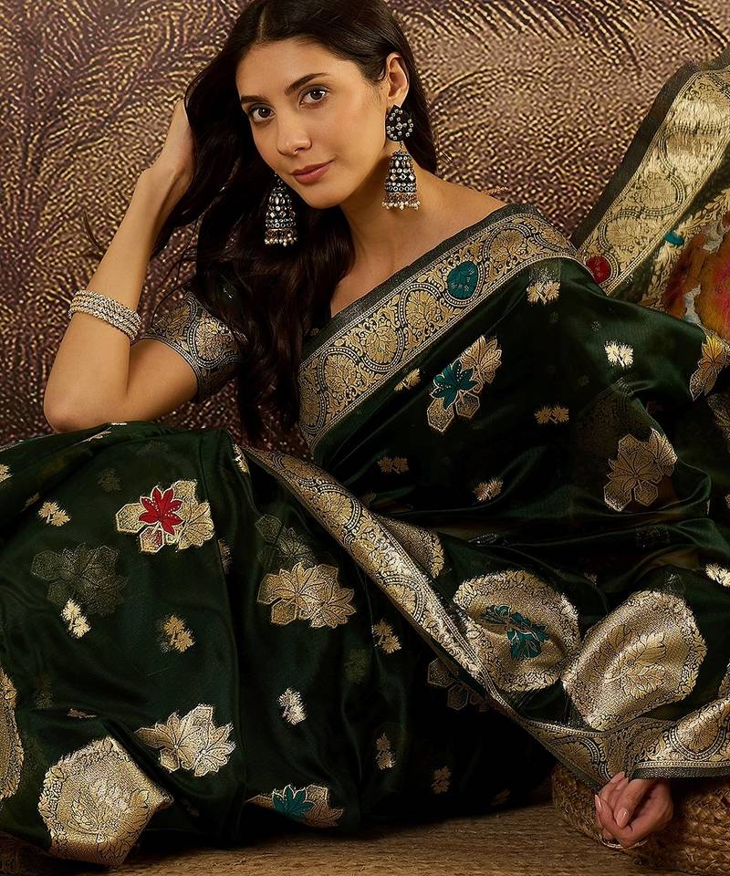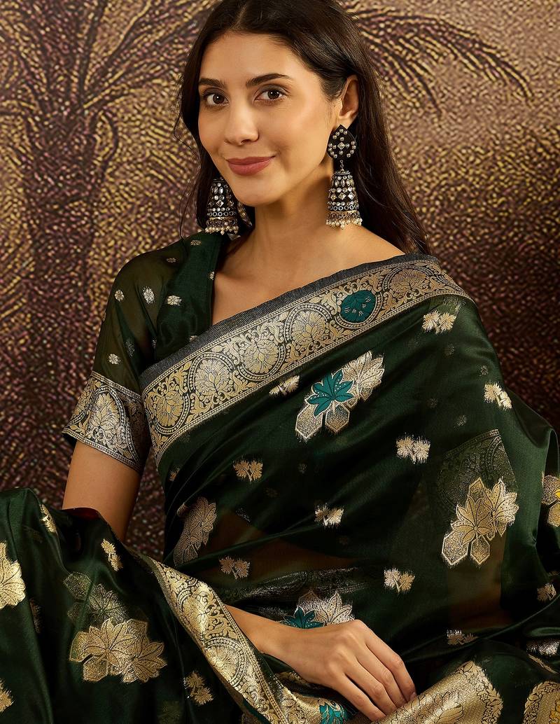 Bottle green organza zari woven saree with unstitched blouse piece