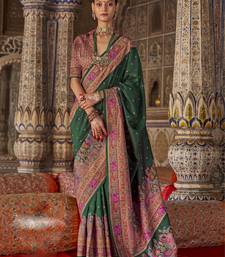 Dark green silk printed saree with unstitched blouse piece