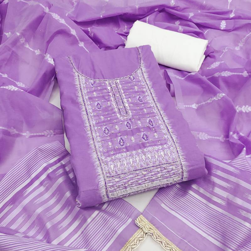 Lavender cotton silk embellished unstitched dress material