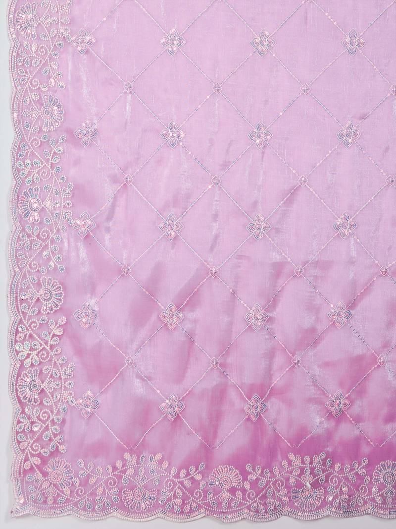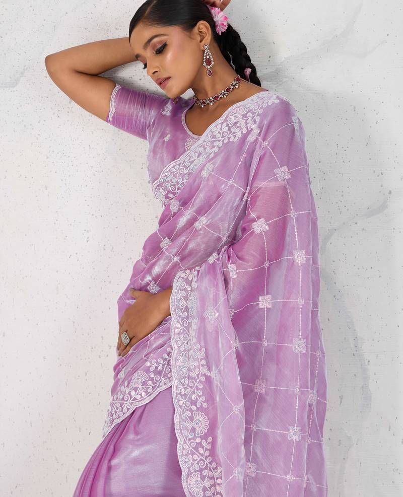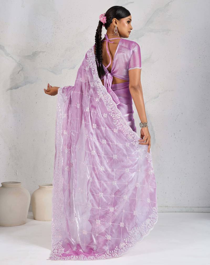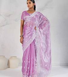 Lavender silk chiffon sequins embroidered saree with unstitched blouse piece