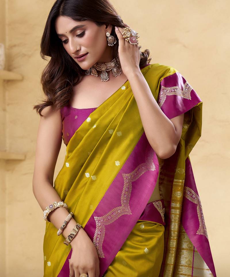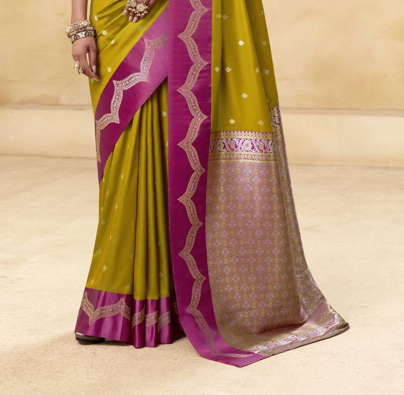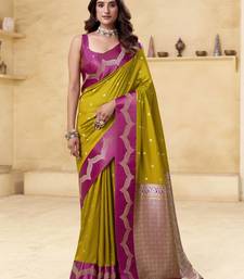 Mehendi satin silk blend woven saree with unstitched blouse piece