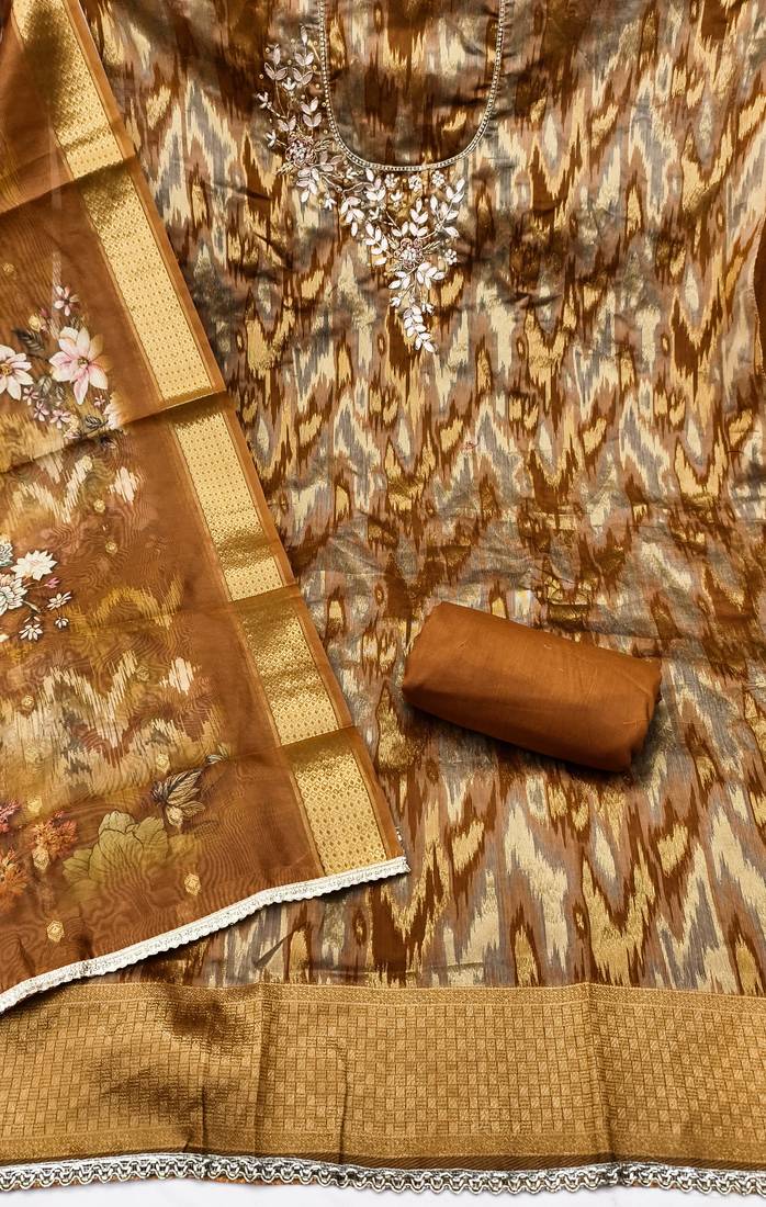 | Product Description | Beautifully Designed & Latest In Trends Women's Ethnic Cotton Silk With Embellished Unstitched Straight Suit. It Is Available In Free Size And Can Be Stitched To Suit Your Measurements. It Is Alterable Up To Chest Size Of 46, Comes With Banarasi Organza Fancy Dupatta And Plain Rayon Un Stitched Bottom. This Dress Would Add Elegance To Your Look. Wear It At Any Occasion By Pairing It With Matching Ethnic Jewelary Like Ethnic Jumkas And Ethnic Footwear Like Mojaris And Juties To Get Complete Ethnic As Well As Fab Festive Look & Get Complimented For Your Impressive Choice. |