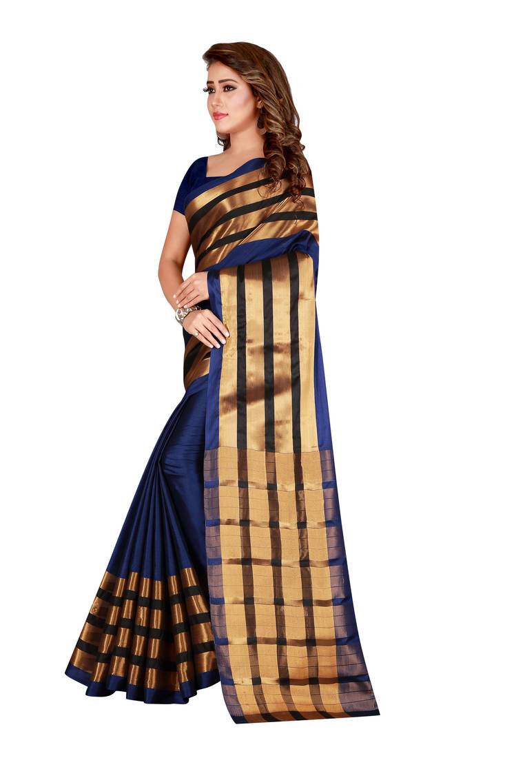 | Product Name | Kimisha Nblue Cotton Stripes Border Work Plain Saree With Running Blouse | |
