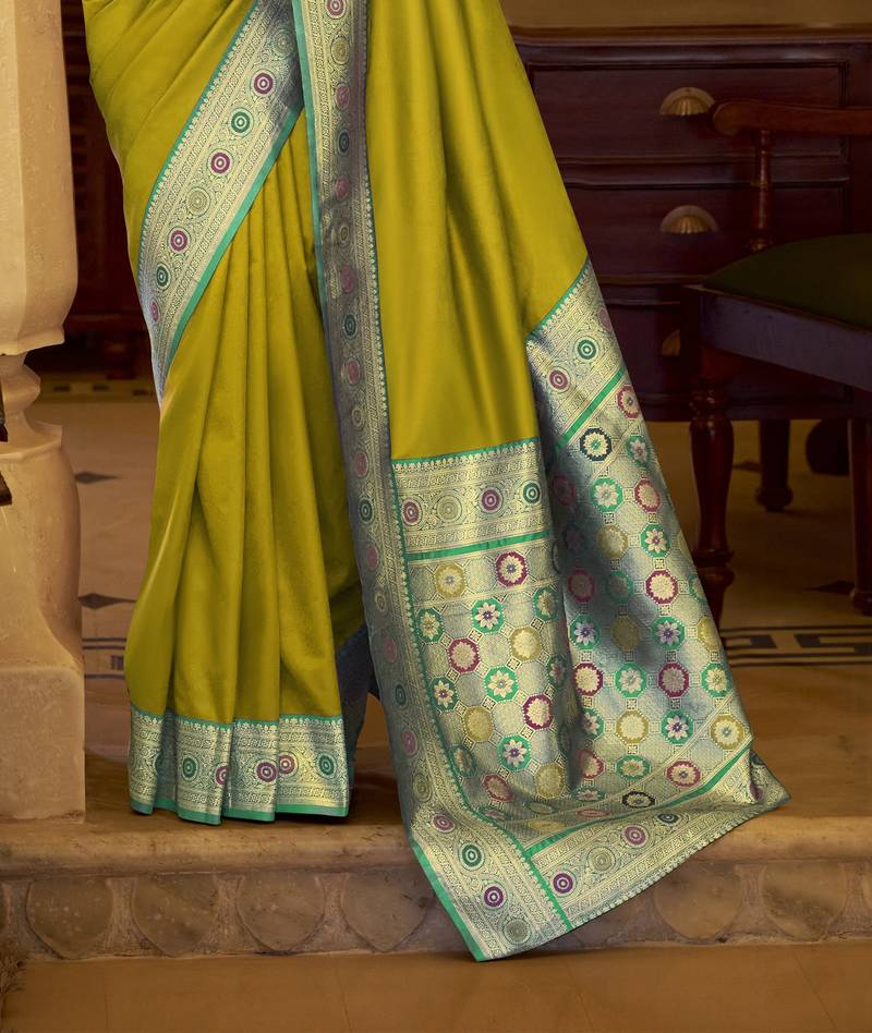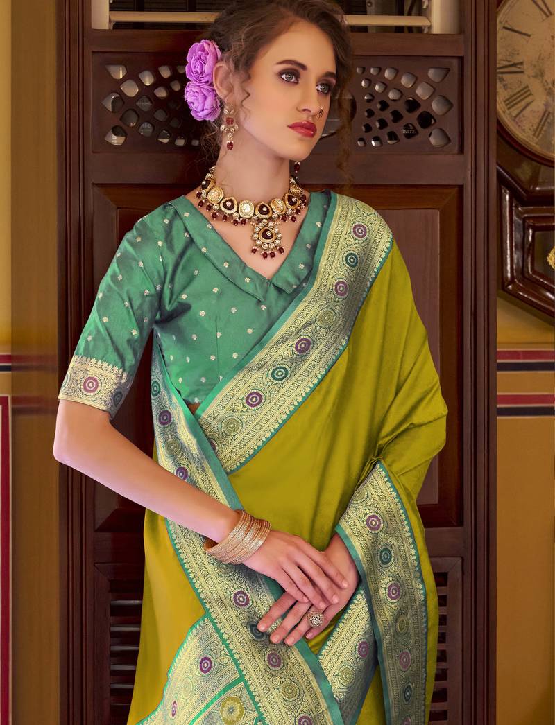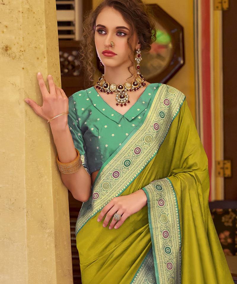 | • | Saree | : | Color- Lime / Fabric- Silk Blend |