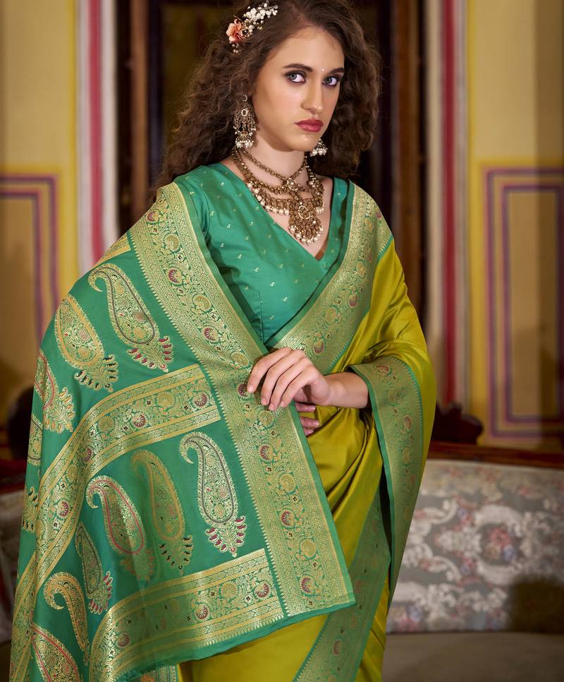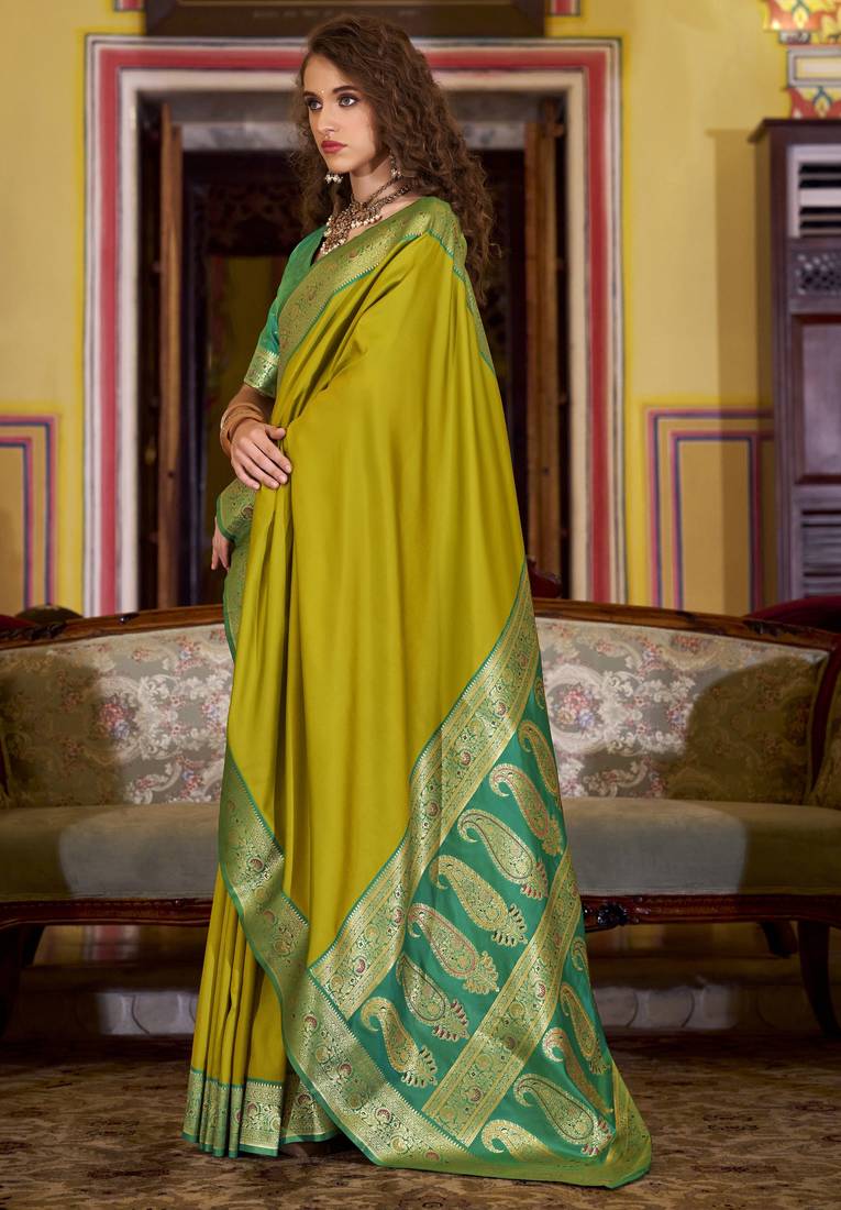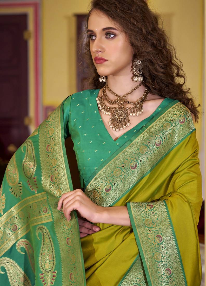 | • | Saree | : | Color- Lime / Fabric- Silk Blend |