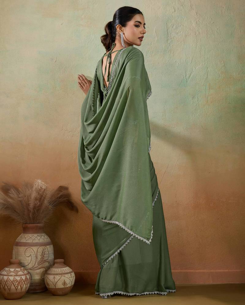 Olive georgette embellished saree with unstitched blouse piece