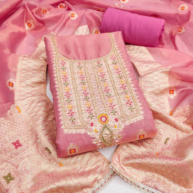 Pink shimmer banarasi woven unstitched dress material