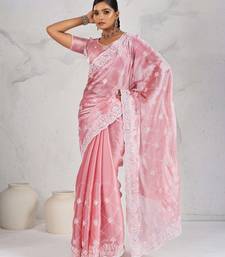 Pink silk chiffon sequins embroidered saree with unstitched blouse piece