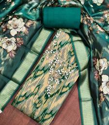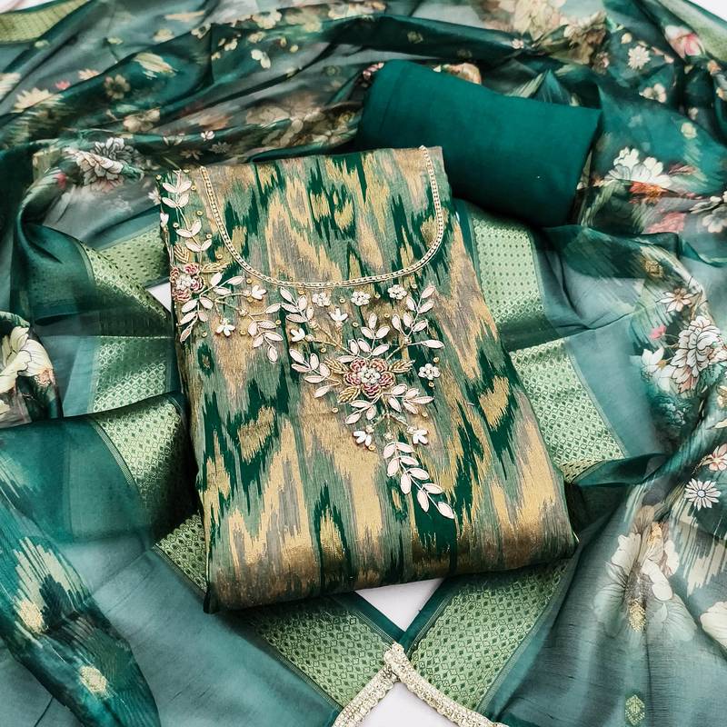 Teal cotton silk embellished unstitched dress material