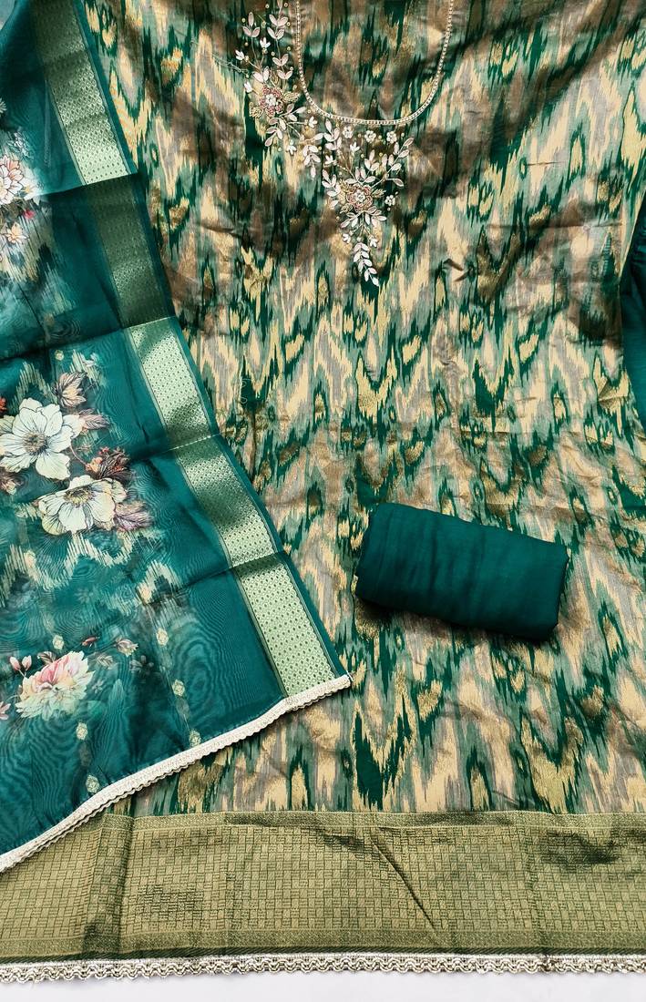 | Product Description | Beautifully Designed & Latest In Trends Women's Ethnic Cotton Silk With Embellished Unstitched Straight Suit. It Is Available In Free Size And Can Be Stitched To Suit Your Measurements. It Is Alterable Up To Chest Size Of 46, Comes With Banarasi Organza Fancy Dupatta And Plain Rayon Un Stitched Bottom. This Dress Would Add Elegance To Your Look. Wear It At Any Occasion By Pairing It With Matching Ethnic Jewelary Like Ethnic Jumkas And Ethnic Footwear Like Mojaris And Juties To Get Complete Ethnic As Well As Fab Festive Look & Get Complimented For Your Impressive Choice. |