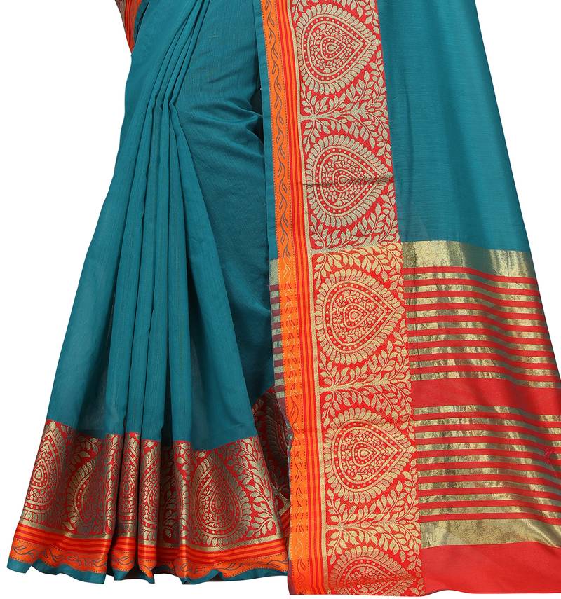 Kimisha women's teal jacquard cotton silk saree with designer pallu