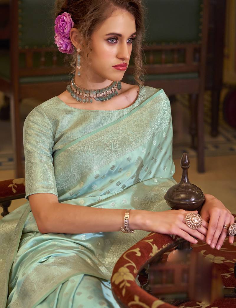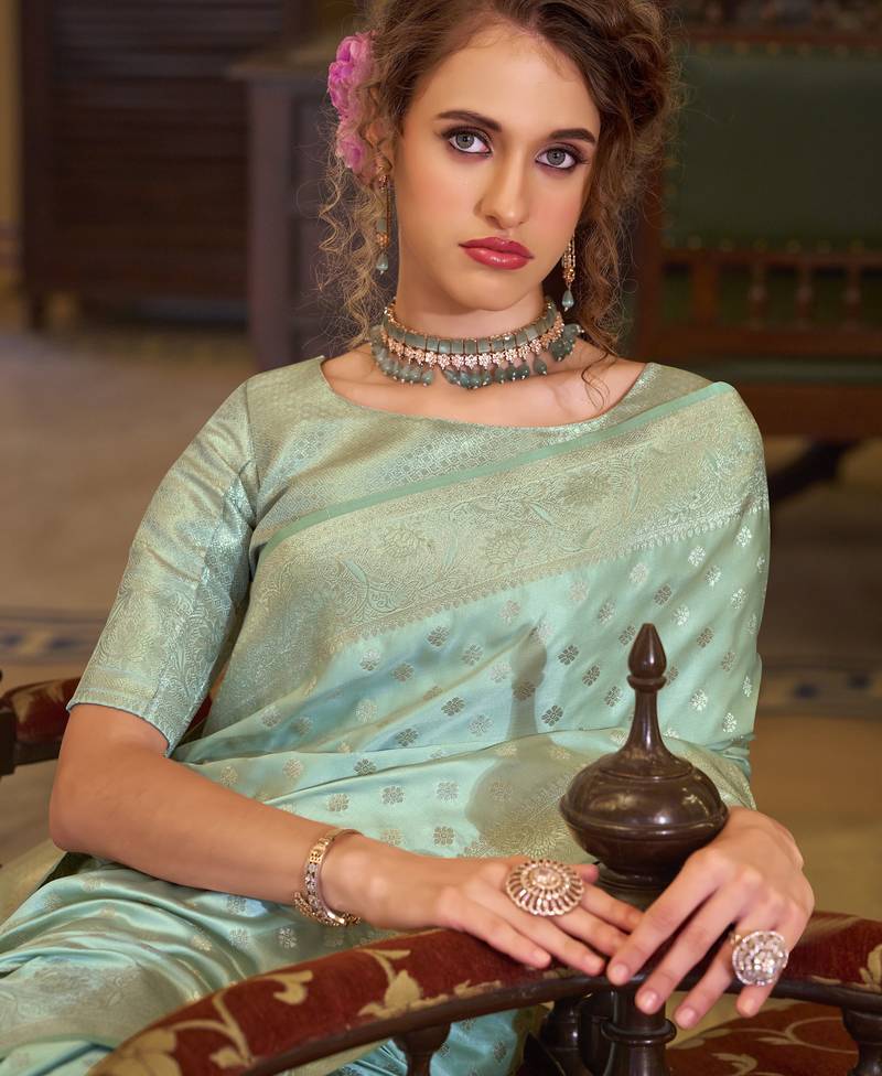 Turquoise satin banarasi silk blend woven saree with unstitched blouse piece