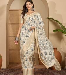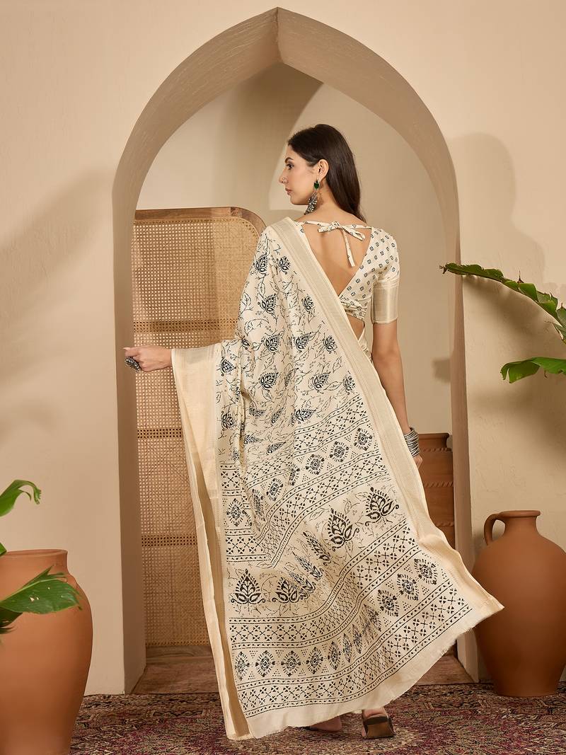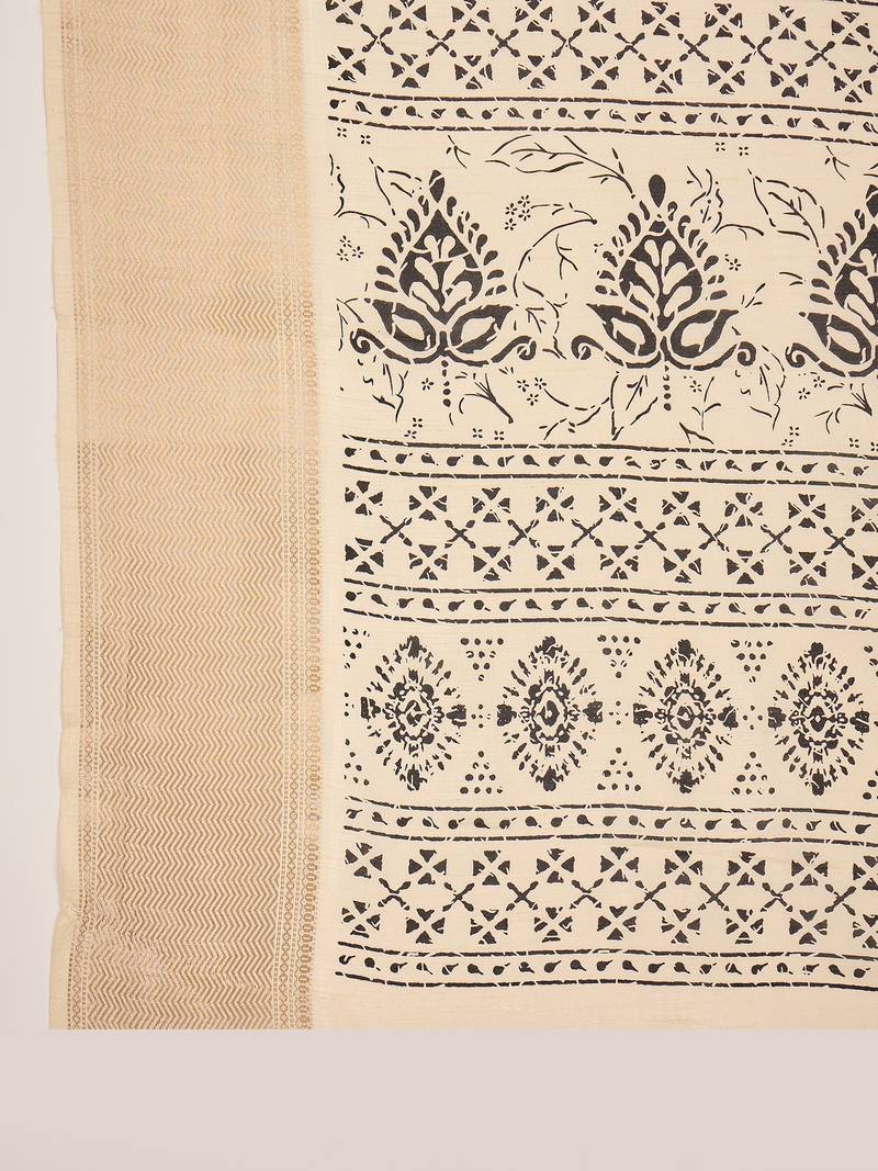 Women's beige cotton silk printed saree with unstitched blouse piece
