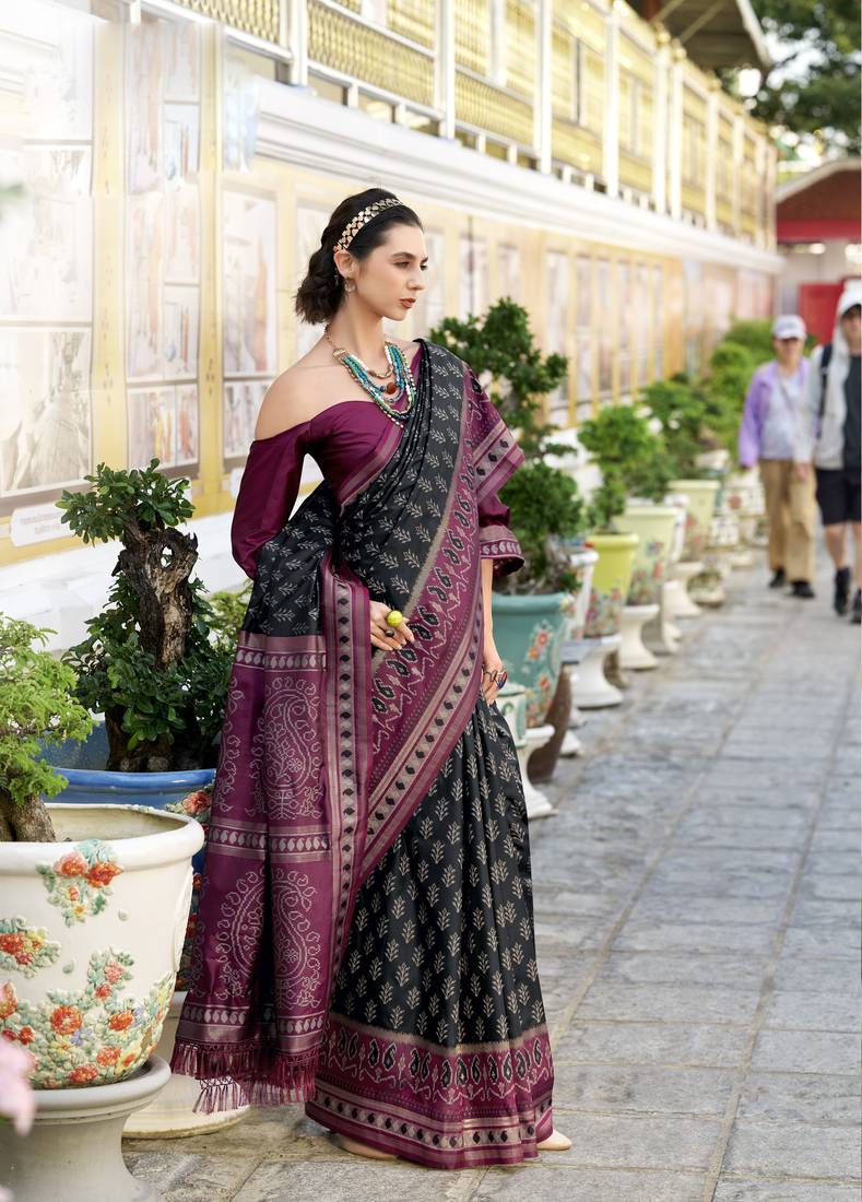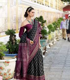 Black soft ikat printed silk blend saree with unstitched blouse piece