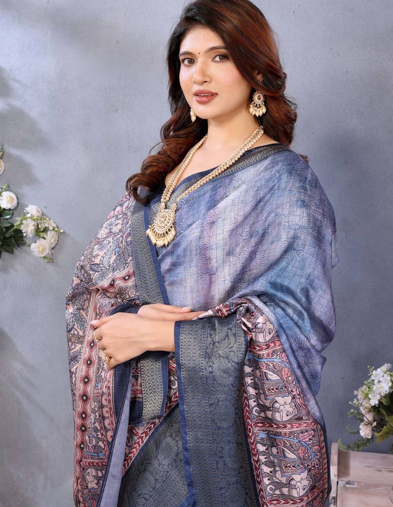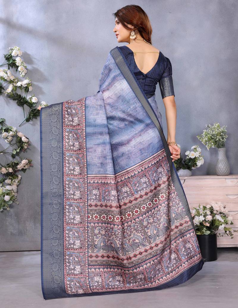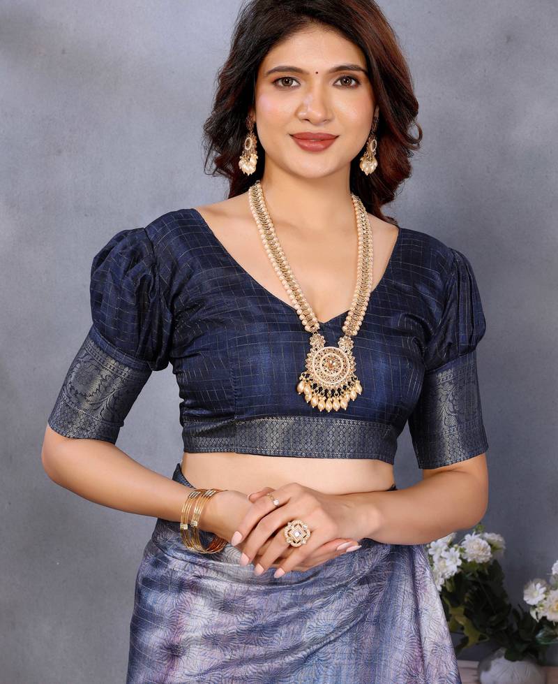 Women's blue dola silk blend digital print saree with unstitched blouse piece